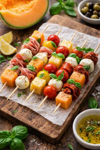 Des brochettes fraîches et colorées, où chaque bouchée joue sur l’équilibre entre douceur, salé et fraîcheur.